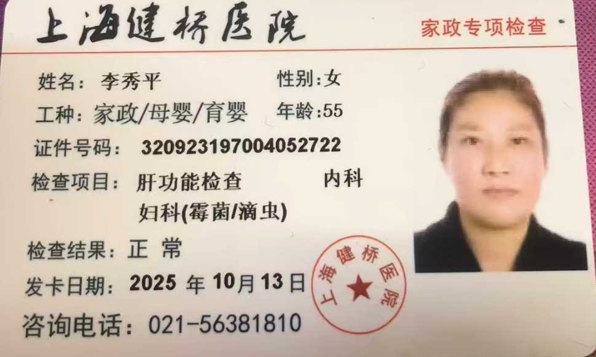 姓名:李秀平 身高: 160 体重: 50KG 年龄:54岁 学历:初中 籍贯:江苏 阜宁 证书:健康证,身份证 工作经验:上海20年,带宝宝15年,照顾老人5年 在静安区做了5年照顾老人,男女老人都做过,自理,半自理,全护理都可以,听的懂上海话,会烧上海菜, 阿姨保洁到位,烧菜好吃,整理收纳,对老人有爱心,耐心,换尿布,脾气性格非常好,做事不计较,是个很好的好阿姨