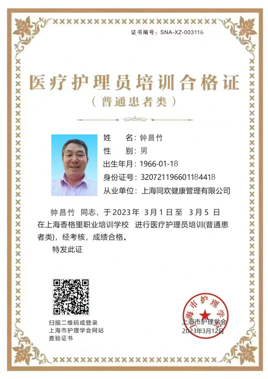 贯籍:江苏省 性别:男性 姓名:钟昌竹 年龄:60岁 身高:172米 证书:护工证 经验:7年 工作经历! 2016年在山东青岛养老院服务中心做护理工作,主要是老人日常生活照顾。2020年在上海青浦区康复医院做一对多护理,照顾病人日常生活起居。2022年左上海市第一人民医院2楼。2023年在静安区共康市扎医院门诊(共和新路西)