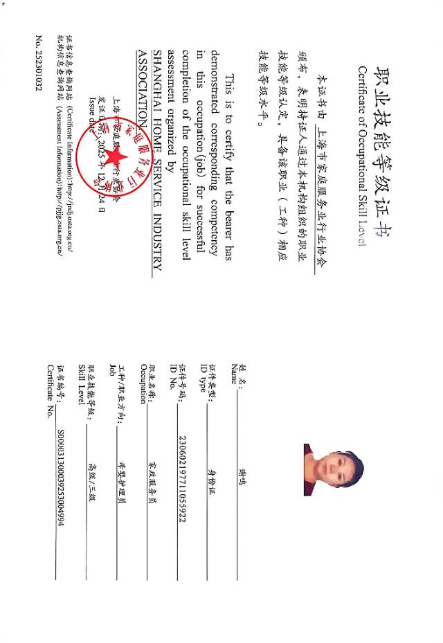 姓名:谢鸣 年龄:48 籍贯:黑龙江 学历:专科 身高:164 体重:128 持有证书:母婴护理证 家政经验四年 工作经历: 2021年-2022年 照看一岁宝宝 2022年-2023年 照顾住家老人夫妇 2023年-2025年 照顾独居老人 阿姨擅长小儿推拿,康复理疗,