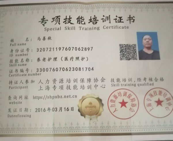 姓名 马善秋 籍贯:江苏 属相龙1976 学历:初中 年龄:48 身高:1.67 体重:145 证书:医疗照护 工作经历:5年 本人老实勤劳不怕苦不怕累,不怕脏。 从2020开始,分别在上海虹口第一人民医院,建工医院,沪东医院,徐汇中心医院,长海医院,华山医院,肺科医院,第六人民医院等等,上海镇宁路,延安西路,江苏路浦东桃林路,博华路等做过 照顾护理病人。 翻身扣背洗澡,打流食 扣大便 ,等等都会。