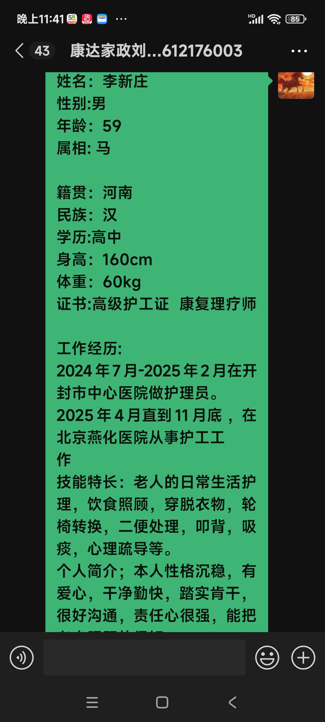 温馨提示:云荷家政平台发布的简历信息由劳动者本人提供,云荷家政平台对信息的真实性、及时性、正确性均不做任何形式保证。
