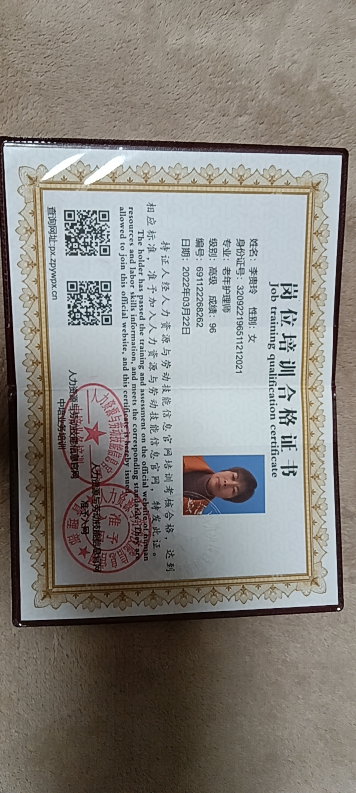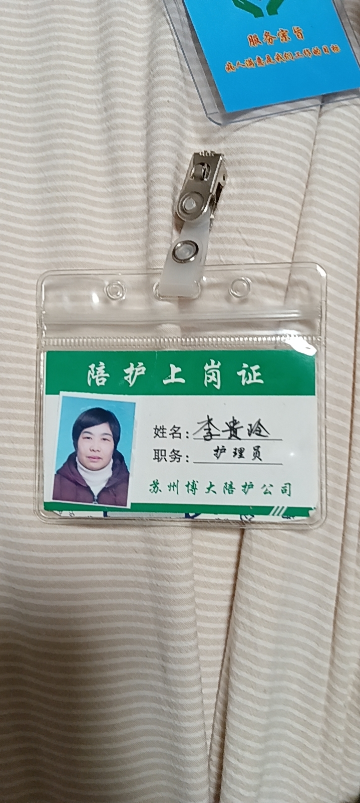 做事认真负责,对客户有耐心,照顾周到 在苏州木渎人民医院做过三年,一直坚持在医院照顾病人,而后到苏州广慈医院做过一年半,一直做的医院护工。后来媳妇怀孕就一直在盐城做的住家陪护,做了两年