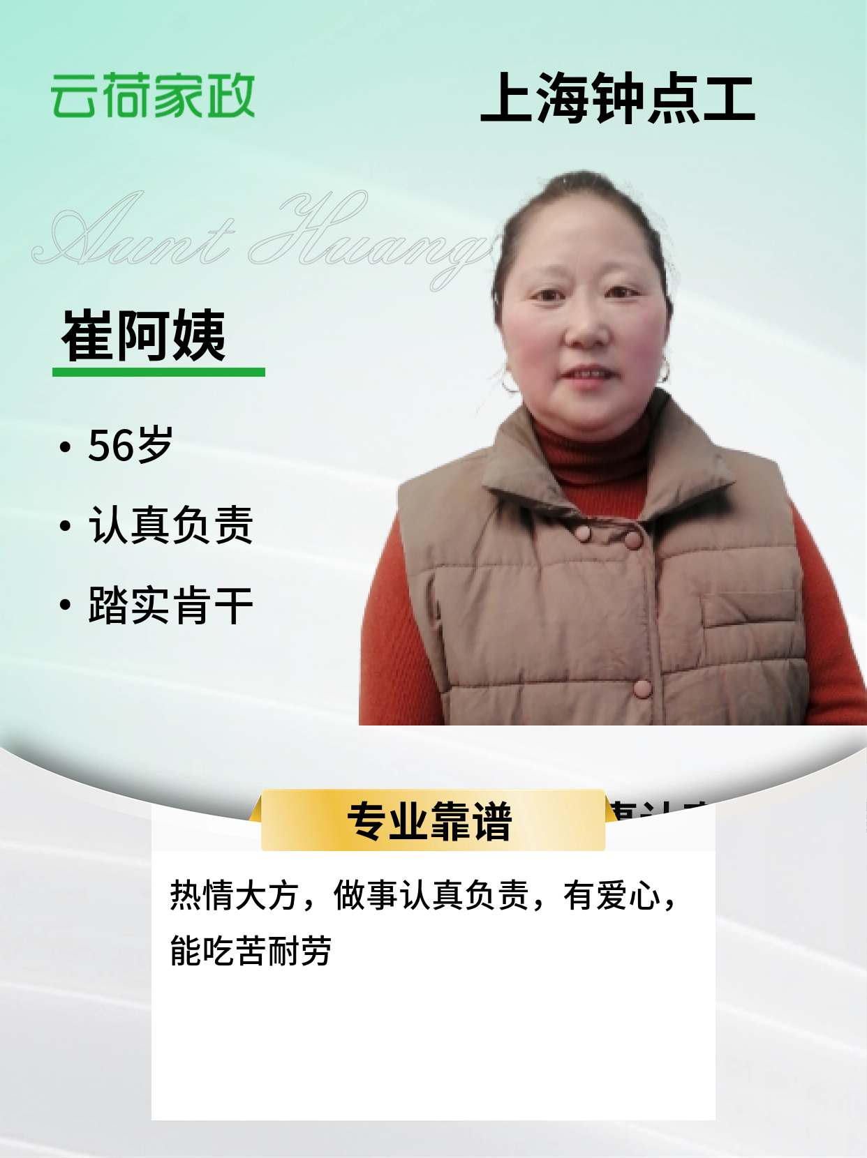自我评价:尊老爱幼,热情大方,做事认真负责,有爱心,能吃苦耐劳,只要你相信我,给我表现机会,我一定好好努力,做更好的自己给你优质的服务!