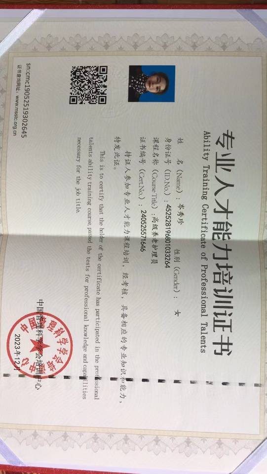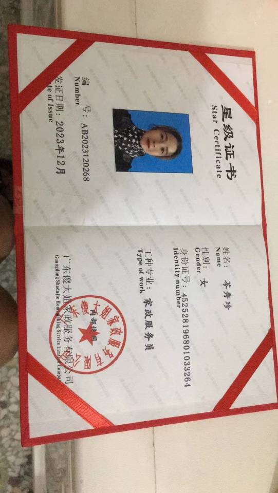 名:岑秀珍 籍贯:广西 年龄:55 身高:158 体重:60kg 婚姻:已婚 学 历:初中 语言:普通话、客家话 厨艺:清淡菜、粤菜 证书:星级家政技能师、高级养老护理。 会护理技能 1. 七步洗手法,穿脱衣服、测体温、测血压、测血糖诺和笔胰岛素、鼻饲、尿袋的使用、呼吸机的佩戴。