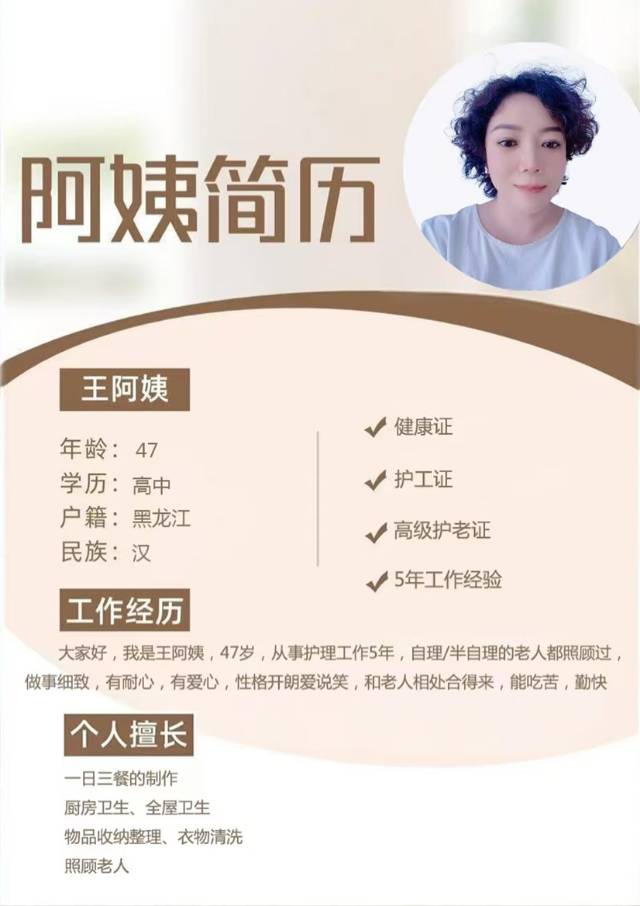 五年的护理经验,只服务了一家雇主 踏实稳重,诚实守信 有爱心,有耐心,有责任心 情绪稳定,善于与老人沟通 做事认真负责