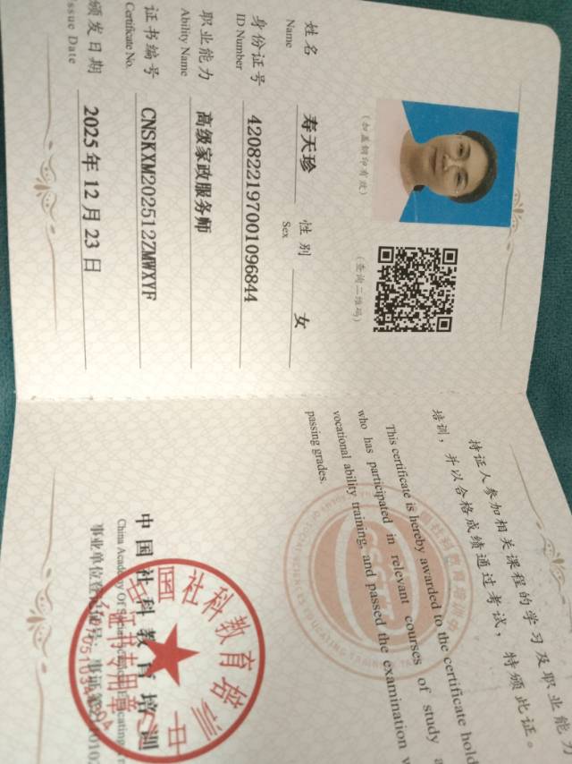 姓名寿天珍56岁 学历:初中 家政工龄:5年 身高:158cm 体重:55kg 证书:高级养老护理证.高级收纳证.高级家政证 疫情前自己开店做美容养生 2021/2023在湖北照顾生病女老人,2024/2025在深圳宝安区照顾7岁女小孩,2026/1月2月在保安照顾帕金森病人