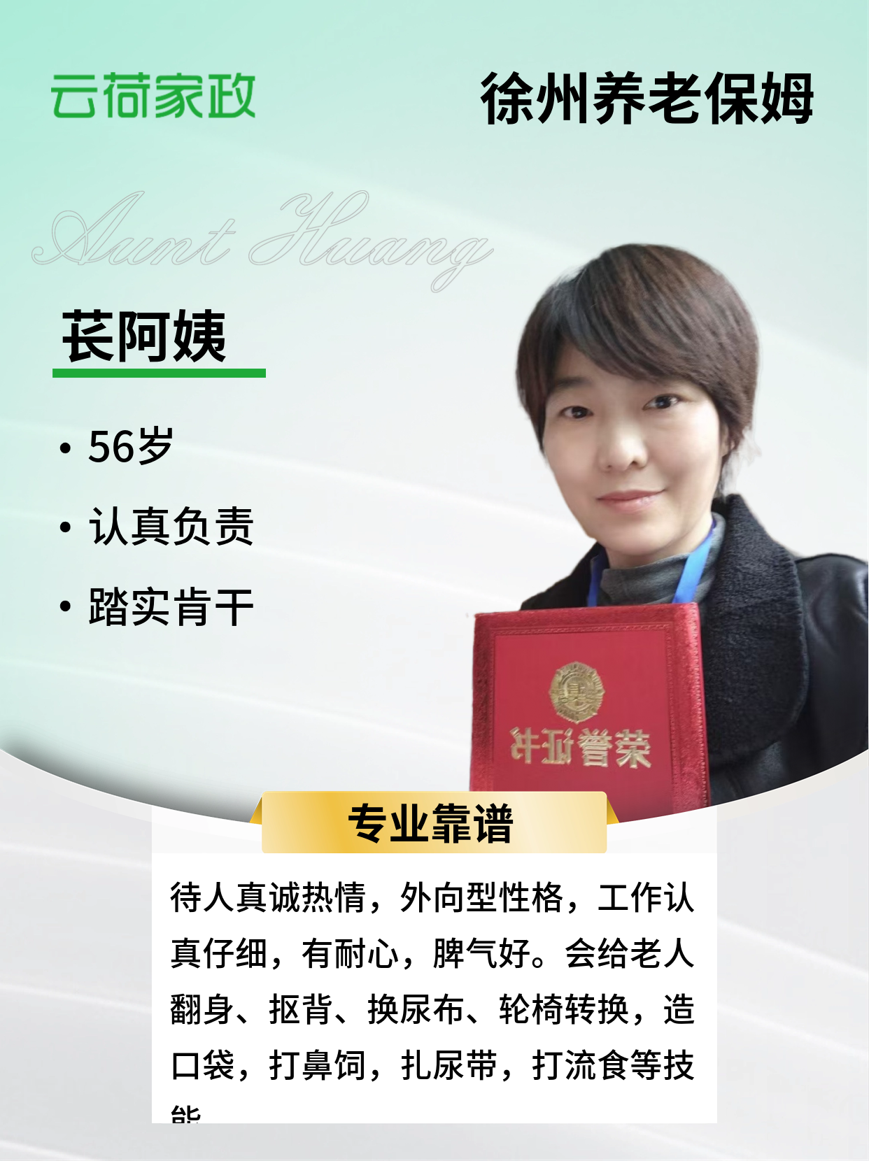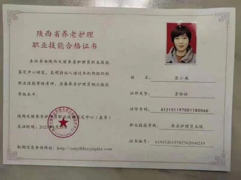 姓名:苌小南 年龄: 55 身高:164 休重:59公斤 籍贯:陕西 学历:中专 2017年—2018年,在陕西老家做医院护工,各种病人都照顾过 2019一2020在上海长宁区世纪之春花园独居女老人全护理 2021一2023年,在浦东新区丽晶别墅做母女俩,妈妈98岁全护理。 2024一2025年,在闵行马桥做独居女老人全护理。 性格特点:待人真诚热情,外向型性格,工作认真仔细,有耐心,脾气好。会给老人翻身、抠背、换尿布、轮椅转换,造口袋,打鼻饲,扎尿带,打流食等技能。