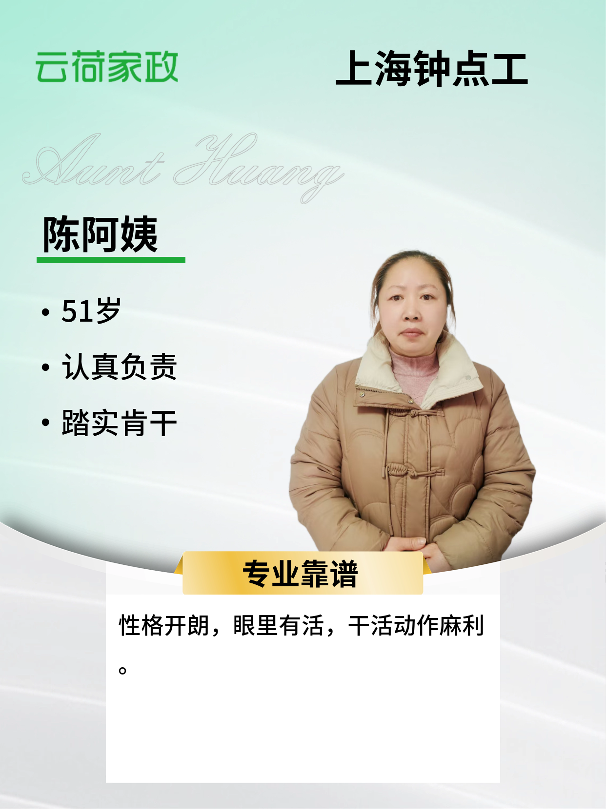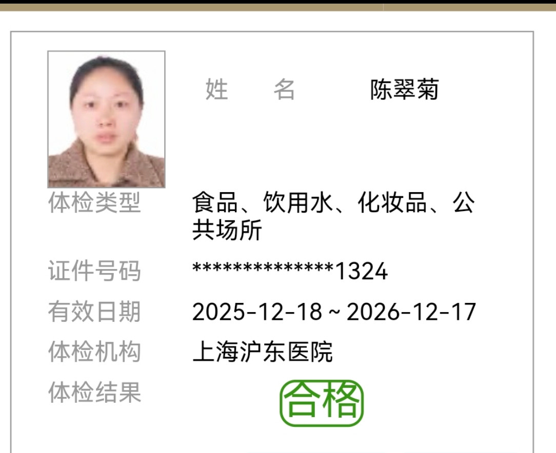 姓名:陈翠菊 年龄:50岁 籍贯:安徽 学历:初中 身高:159cm 体重:60kg 工作经验:4年多 2021年~2022年,在上海浦东巨峰路,150多平,上海家庭,4口之家,主要做饭,保洁,整理收纳等 2023~2026年至今,在上海浦东佳林路,巨峰路,东陆路,东波路等做钟点工,主要做饭,保洁,整理收纳,附带接送5岁女宝上下学 擅长烧上海菜,南方菜,海鲜,红烧肉,阿姨性格开朗,眼里有活,干活动作麻利,能听懂上海话 阿姨3口之家,儿子已工作,一家人在上海,能长期稳定做