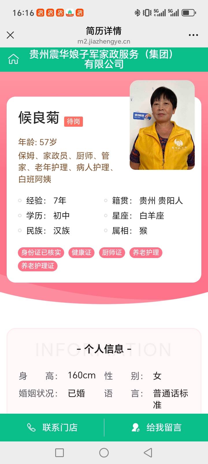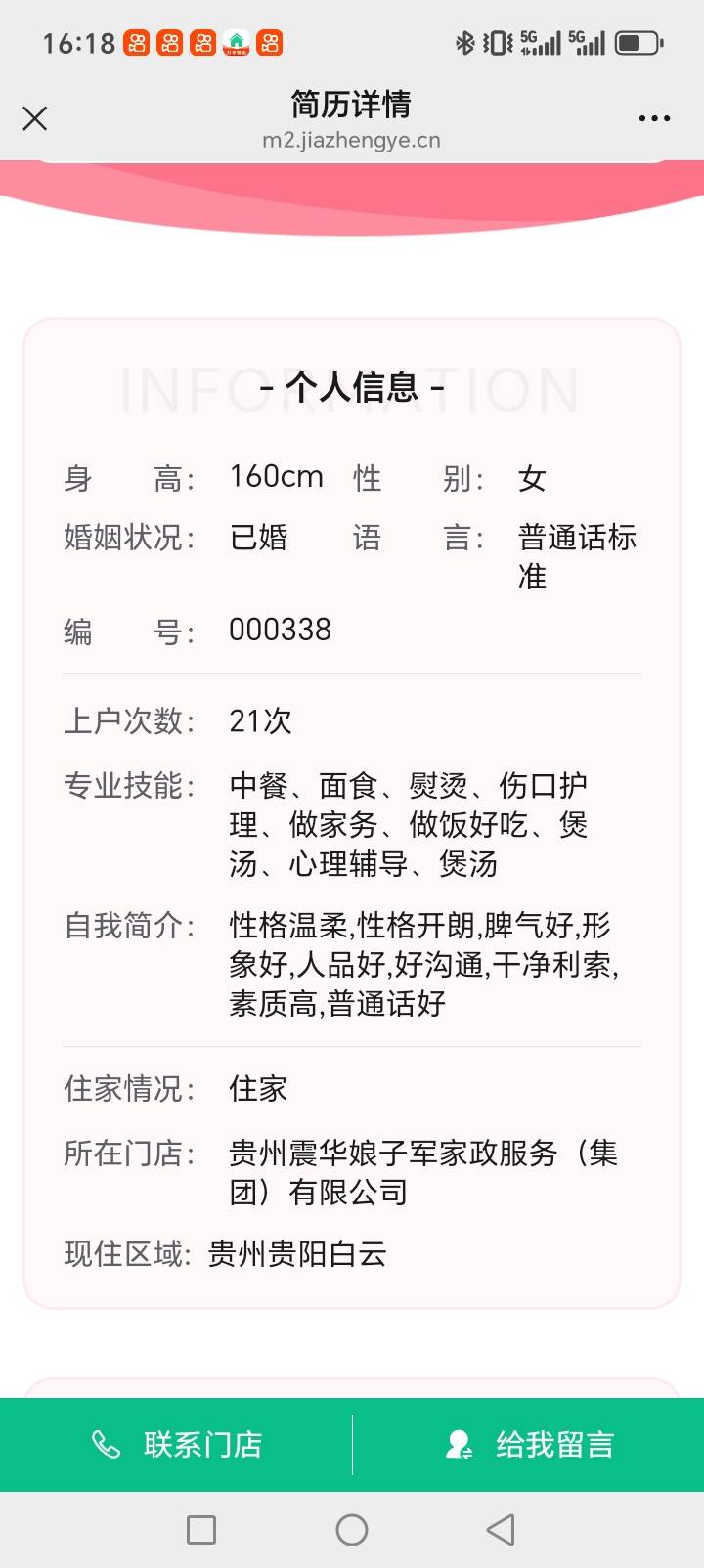 温馨提示:云荷家政平台发布的简历信息由劳动者本人提供,云荷家政平台对信息的真实性、及时性、正确性均不做任何形式保证。