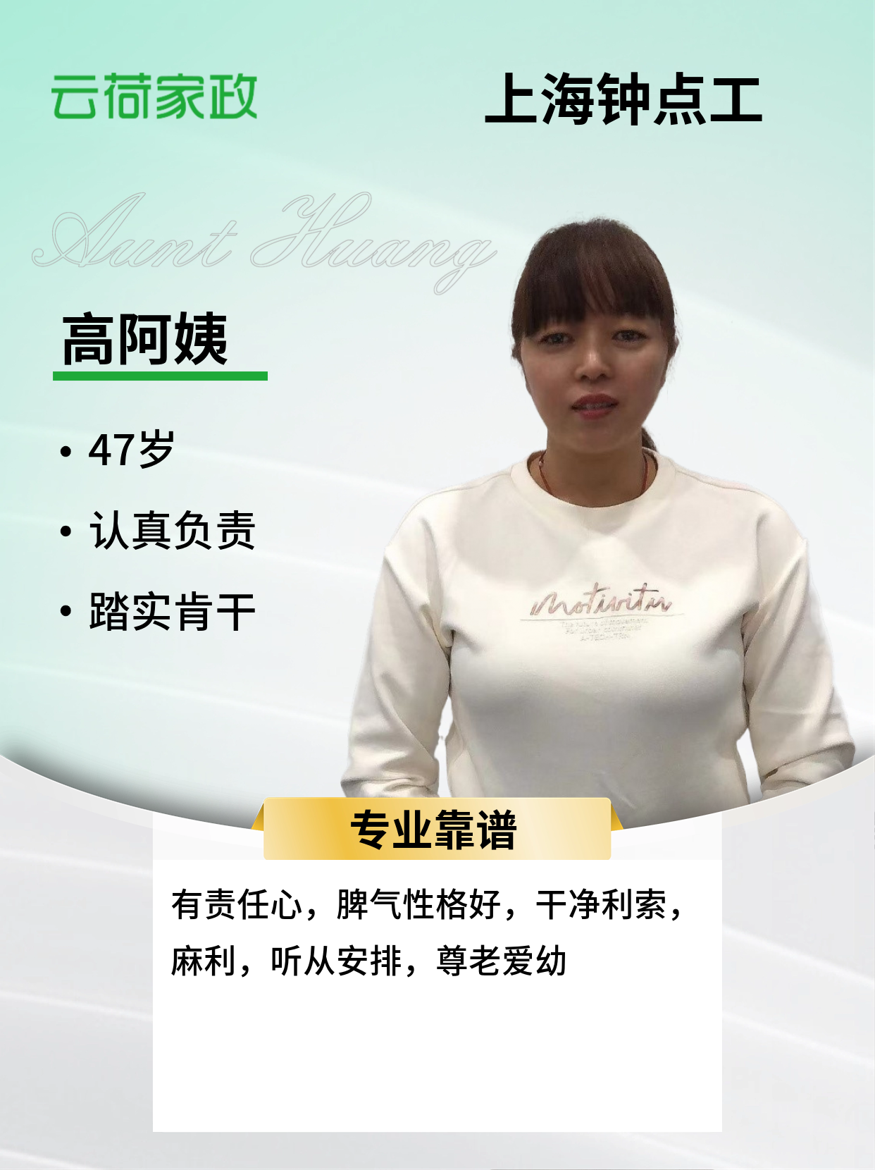 温馨提示:云荷家政平台发布的简历信息由劳动者本人提供,云荷家政平台对信息的真实性、及时性、正确性均不做任何形式保证。