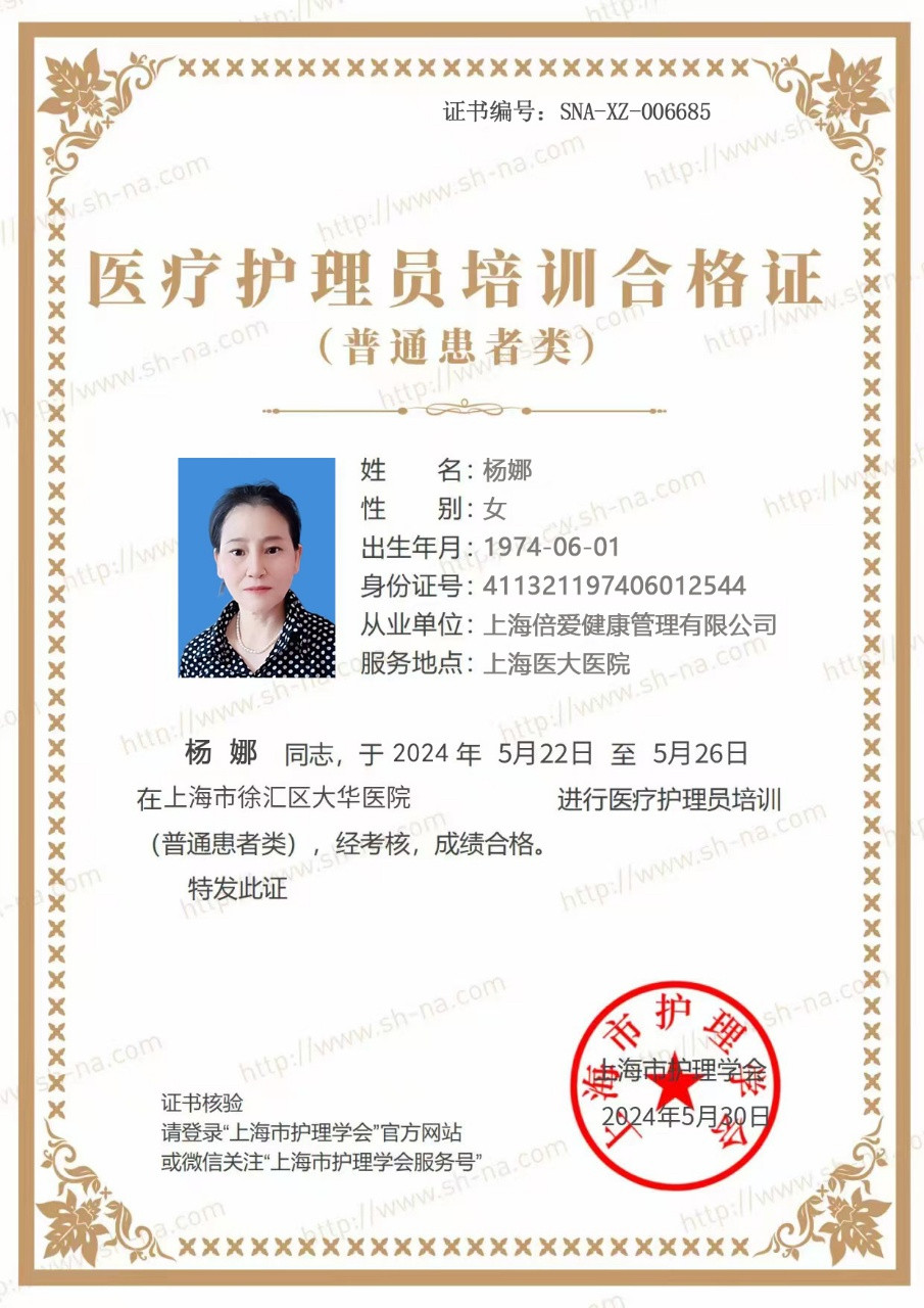 姓名:杨娜 性别:女 年龄:51岁 身高:身高158,体重110斤 文化:初中 建康状况:良好 证件有: 身份证、护工证、健康证; 工作经验:8年 个人技能: 2019 年浦东新区仁济医院重症监护室 2022年闵行赫森康复医院 2023年浦东新区三林社服务中心 2024 年松江亲清护理院 2025年上海中医院 自我评价: 翻身、扣被 对病人有耐心、爱心、认真细心、不怕脏、做事干净利落,能很好的与客户及家人融洽相处。