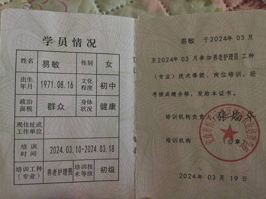 我是一名在西安干了三年多住家照顾老人的阿姨 待人真诚善良 从事照顾过自理 半自理不能自理的老人 象脑梗恢复期 阿尔滋海默症的老人都照顾过 在对待老人方面有耐心 有爱心 也有责任心 同时也有几年的工作经验