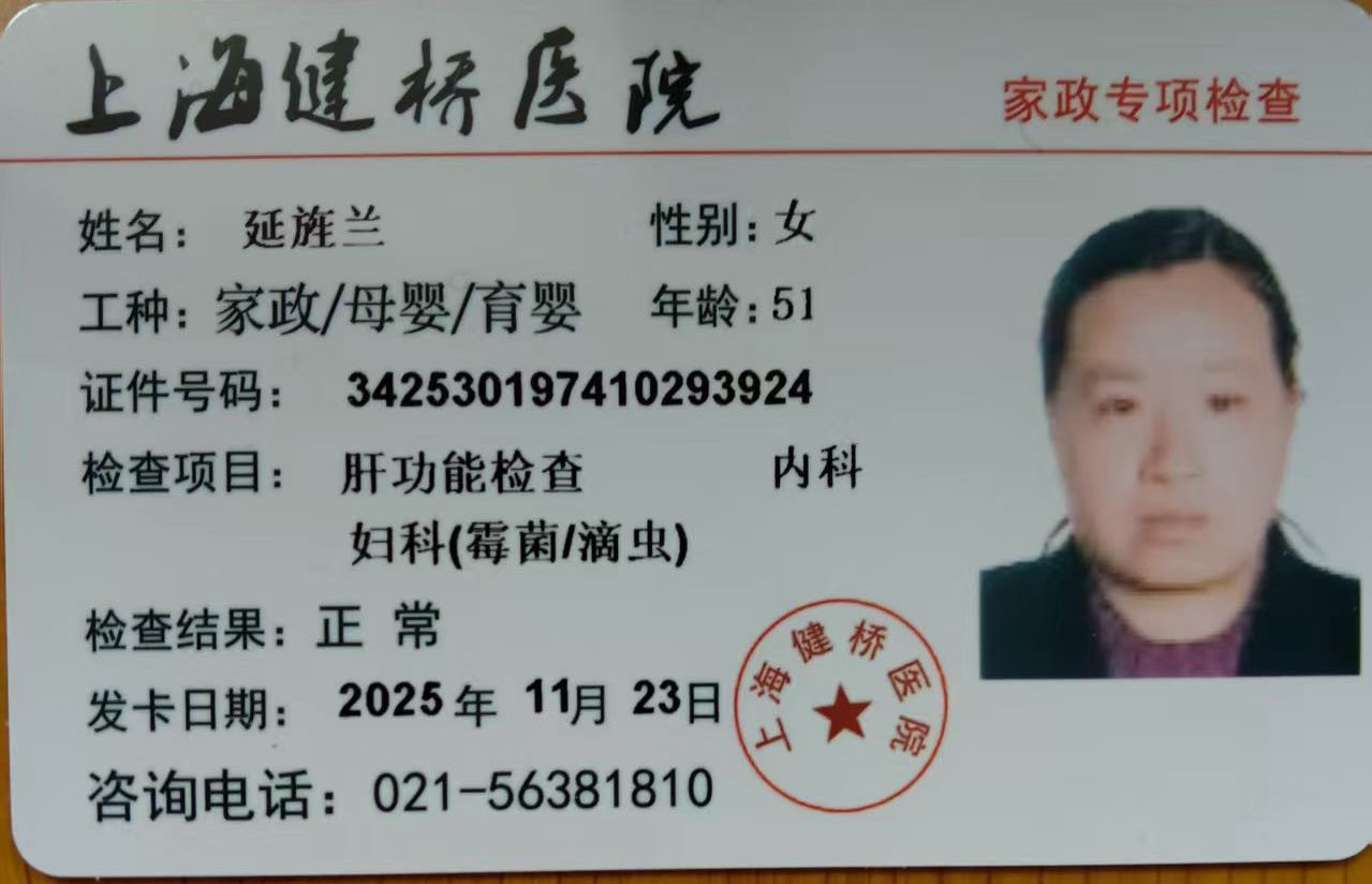 姓名:延旌兰 年龄:51 身高:155厘米 体重:52公斤 籍贯:安徽 文化:初中 星级:烧饭保洁 从业经验 2004年至2014年。在静安区。河滨豪园四口之家。做钟点工至今 2015年至2022年。杨浦区隆昌路做钟点工,主要做饭保洁。 2023年在杨浦区眉州路做钟点工至今,做饭保洁,搭手照顾小宝。 阿姨做事动作麻利,烧菜好吃,会做宝宝辅食,阿姨工作稳定