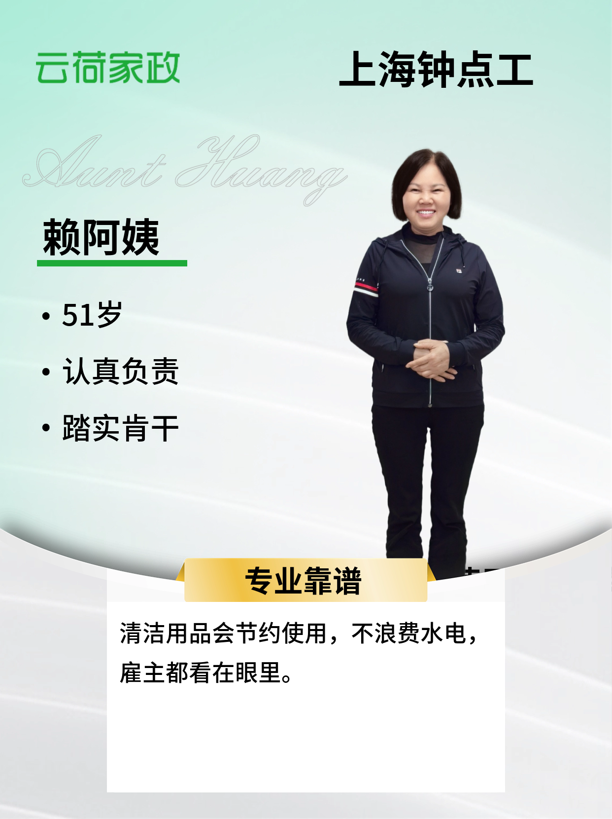 自我评价:尊老爱幼,热情大方,做事认真负责,有爱心,能吃苦耐劳,只要你相信我,给我表现机会,我一定好好努力,做更好的自己给你优质的服务!